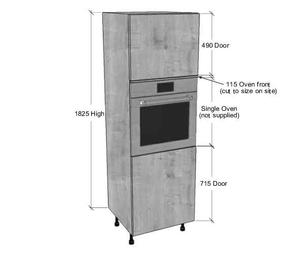 1 @ 490mm (h) x 596mm (w) - Top Door 1 @ 115mm (h) x 596mm (w) - Oven Trimmer (cut to size on site) 1 @ 715mm (h) x 596mm (w) - Bottom Door |