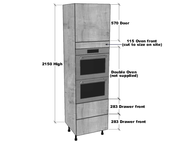 1 @ 570mm (h) x 596mm (w) - Top Door 1 @ 115mm (h) x 596mm (w) - Oven Trimmer (cut to size on site) 2 @ 283mm (h) x 596mm (w) - Bottom Drawer fronts |