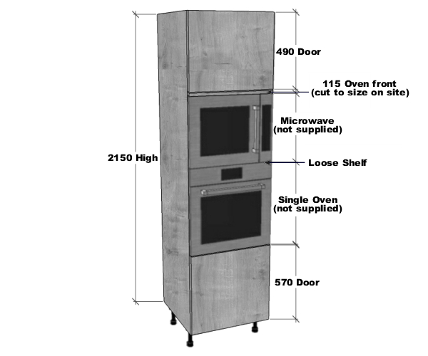 1 @ 490mm (h) x 596mm (w) - Top Door 1 @ 115mm (h) x 596mm (w) - Oven Trimmer (cut to size on site) 1 @ 570mm (h) x 596mm (w) - Bottom Door |