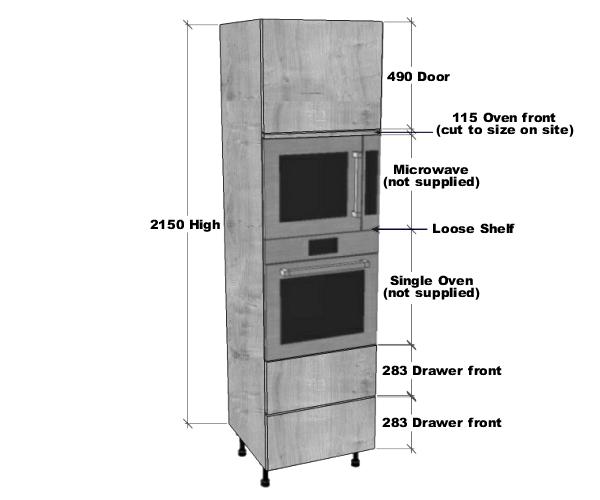1 @ 490mm (h) x 596mm (w) - Top Door 1 @ 115mm (h) x 596mm (w) - Oven Trimmer (cut to size on site) 2 @ 283mm (h) x 596mm (w) - Bottom Drawer fronts |