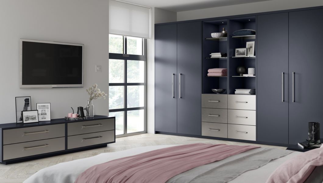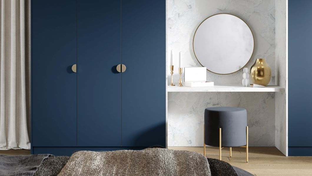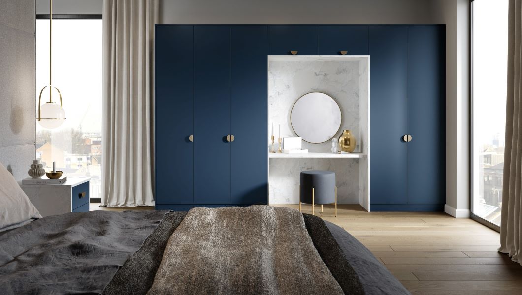 Zurfiz serica matt bedroom cupboard doors in Indigo Blue provide a modern aesthetic, perfect for designing your dream bedroom.