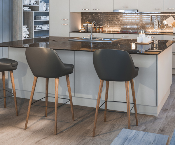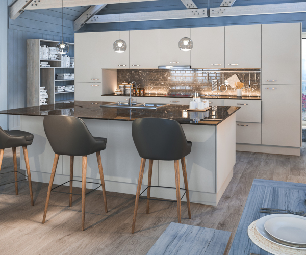 The cool tones of our Firbeck Supermatt Light Grey doors create a fashionable ambience for your open plan kitchen as natural light pours in.