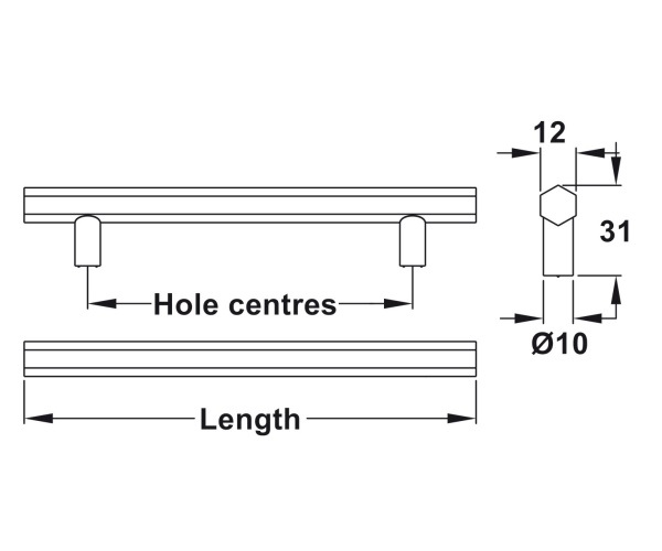 The Pencil Cupboard Handle is a T-bar-shaped cupboard handle with a hexagonal grip design, much like a traditional pencil, which sits on two cylindrical legs.