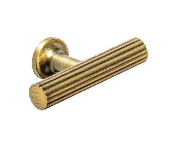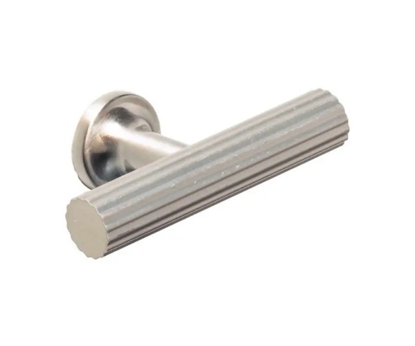 The Strand T-bar Cupboard Knob is a modern cylindrical bar attached to a circular rose, to create a T shape. The cylindrical pull has a modern linear pattern and the rose has concealed fixings for a sleek and clean aesthetic.