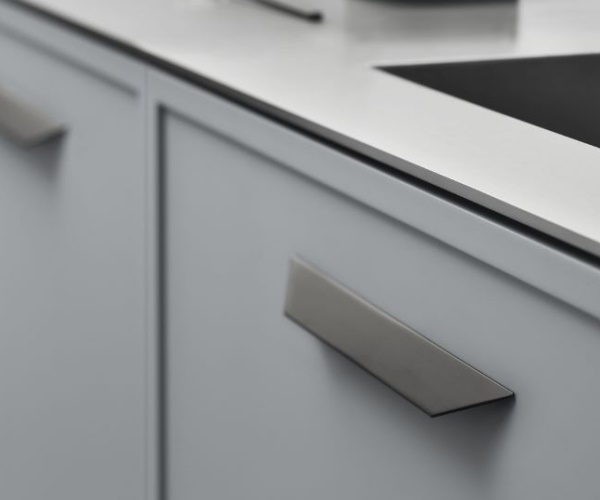 A streamlined cabinet handle designed by Australian Adam Laws, and produced by Danish Furnipart. Streamline fits perfectly in a modern kitchen, the large version fits well as an edge-to-edge handle, while the smaller version is best suited as a traditionally mounted handle. The cabinet handle is made of aluminum and has a black finish.