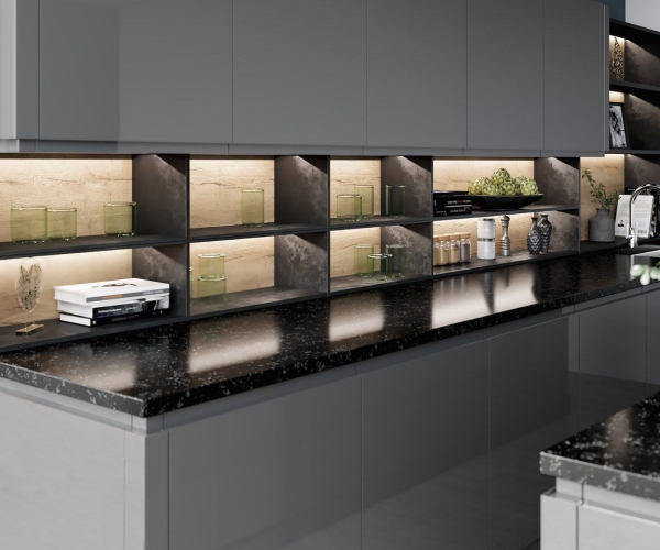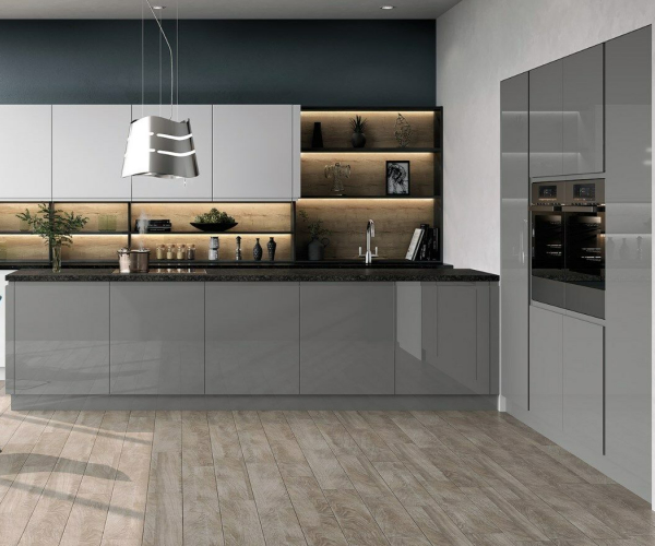 Fashion a beautiful modern kitchen with the Lucente Handleless Gloss Dust Grey.