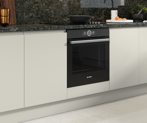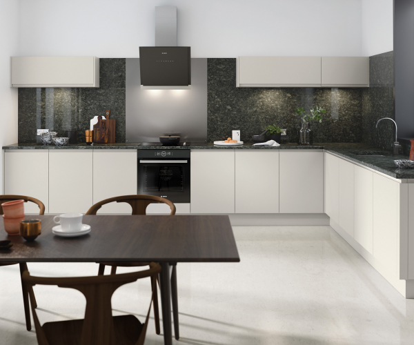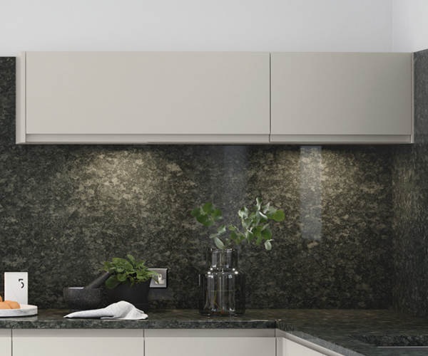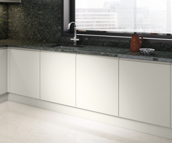 A powerful statement is created with the ultra-contemporary and minimalist Lucente matt Light Grey handleless door.