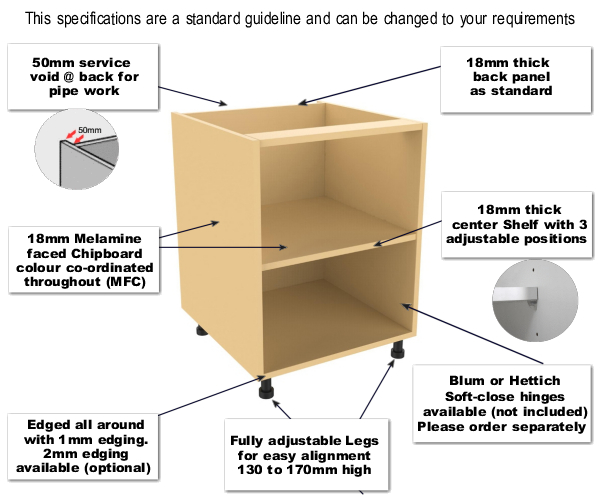 Legs size: | 150mm PVC adjustable Kitchen legs (Included) |