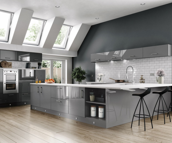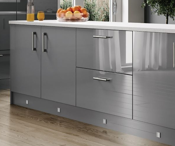 Super sleek Vivo+ Gloss Dust Grey is a glossy opaque grey that is well suited for an ultra modern kitchen design.