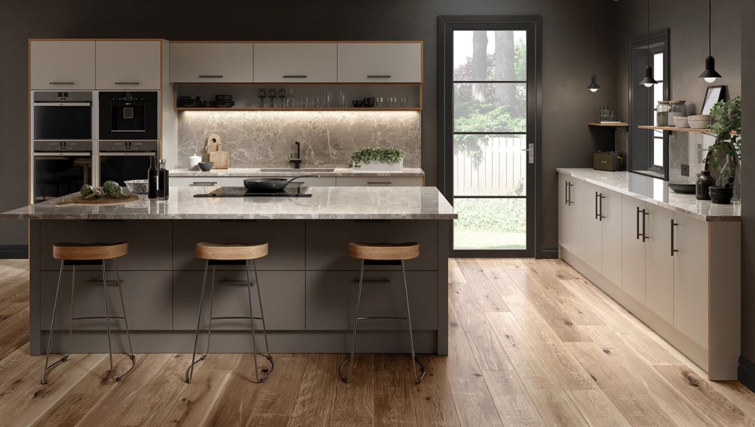 Zurfiz kitchen doors in serica matt Pebble and matt Taupe, perfect for kitchens of all sizes